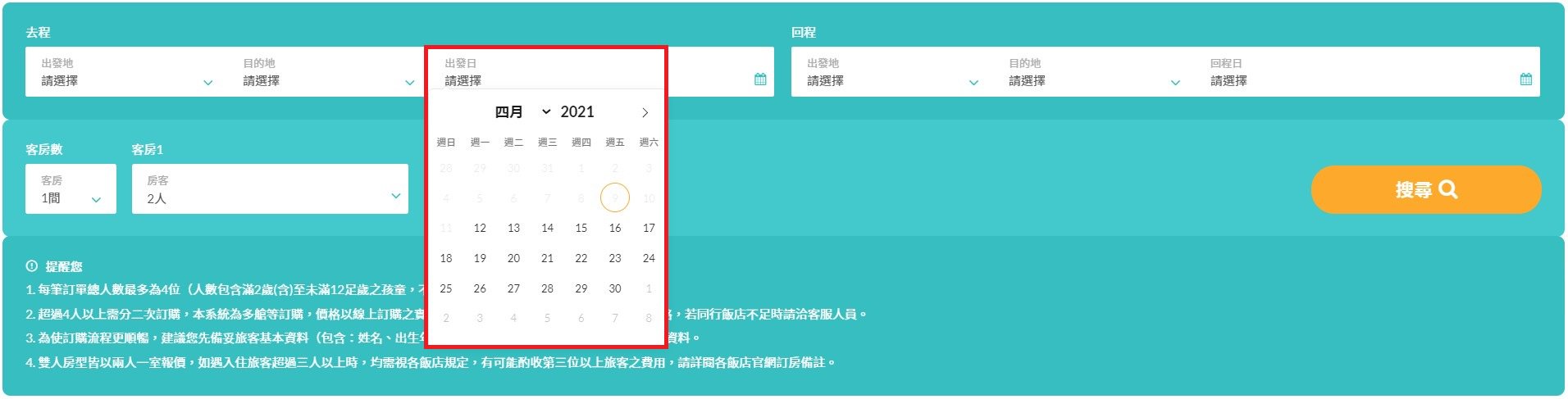 - 超過4人以上需分二次訂購,本系統為多艙等訂購,價格以線上訂購之實際售價為準,不同筆訂單可能會產生不同價格。