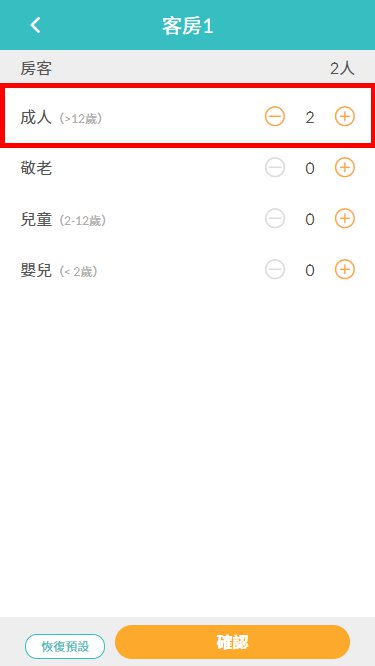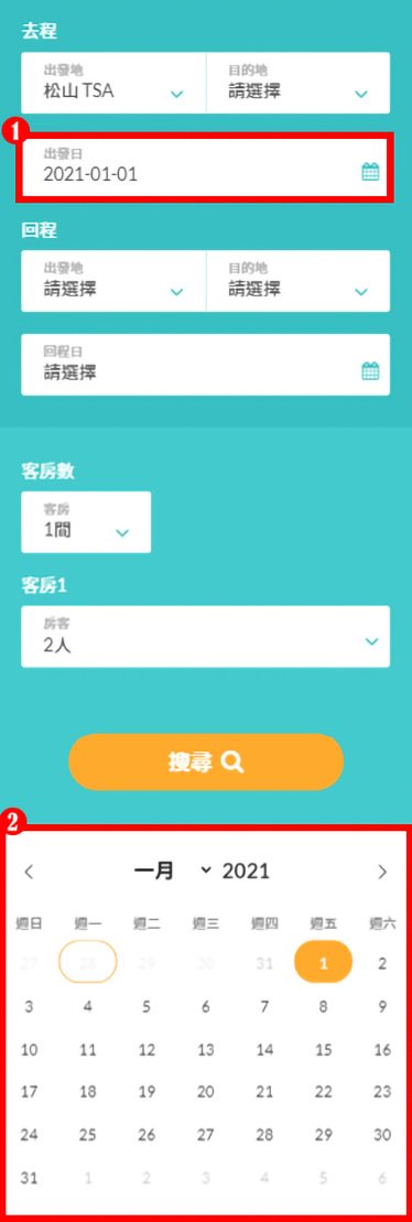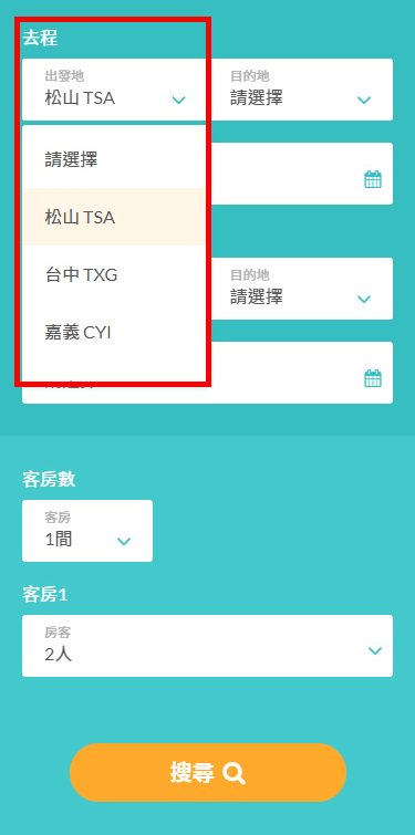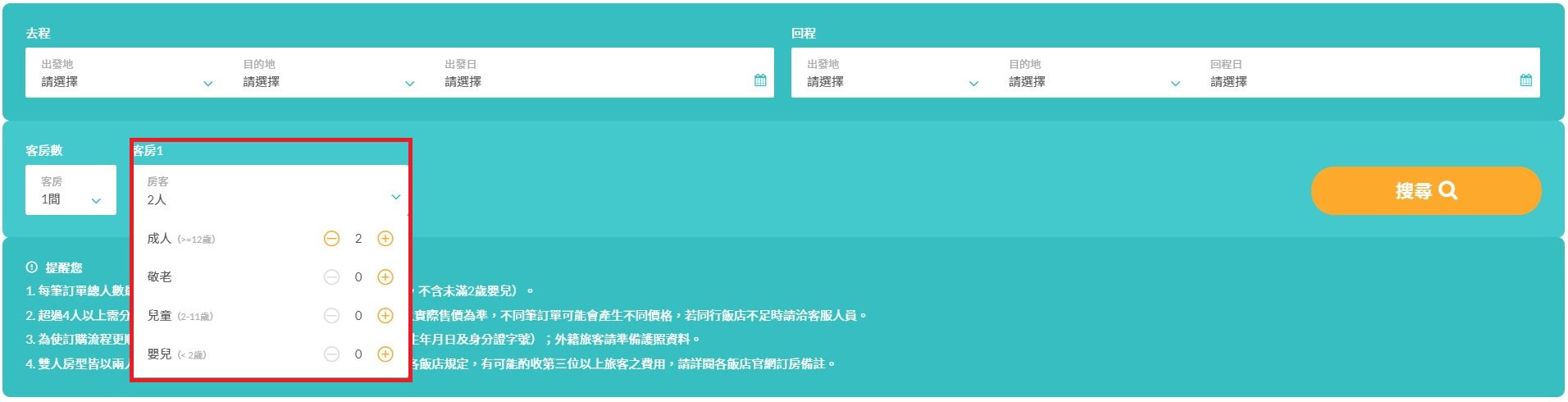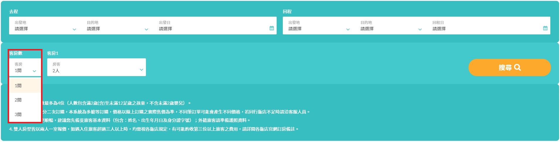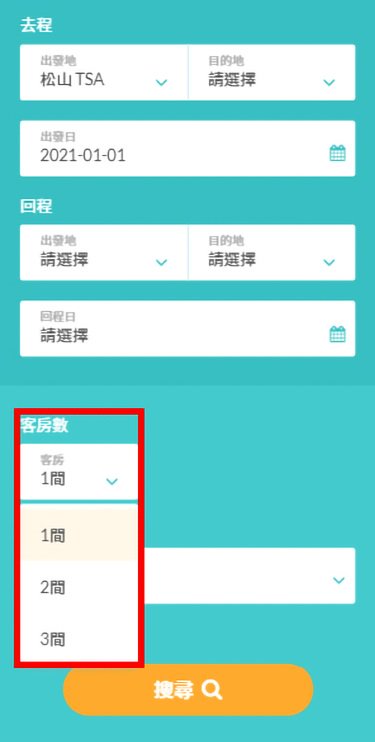 4. 選擇每房之入住人數,按下『搜尋』按鈕,查詢航班