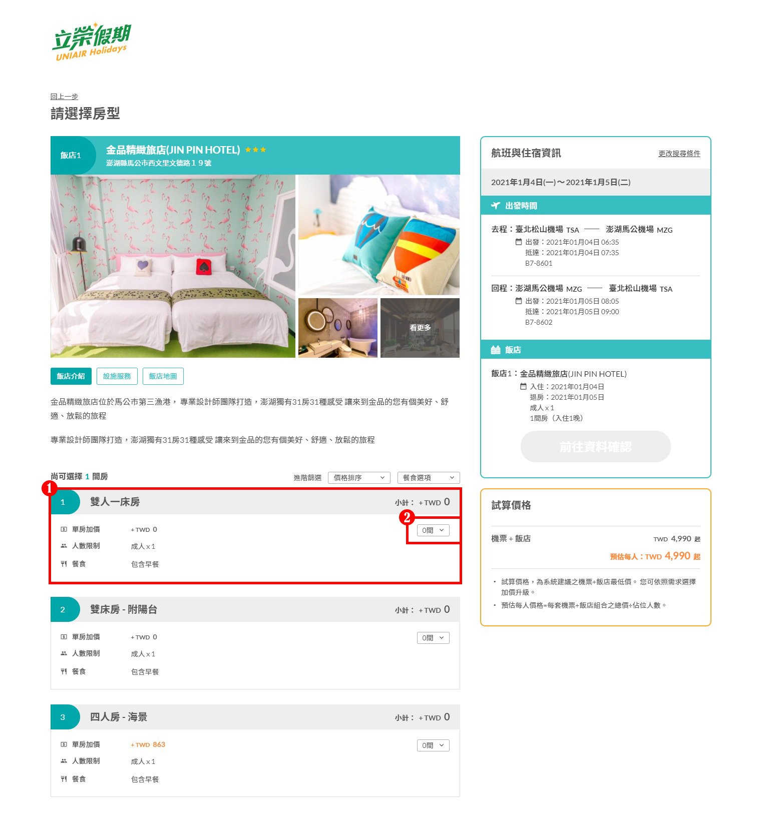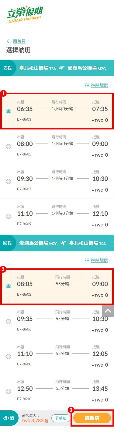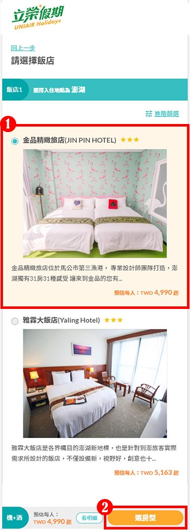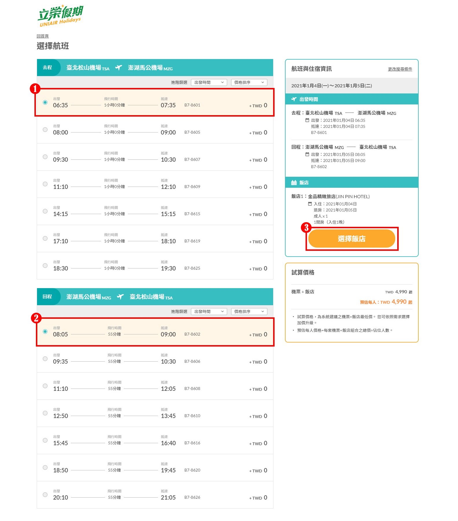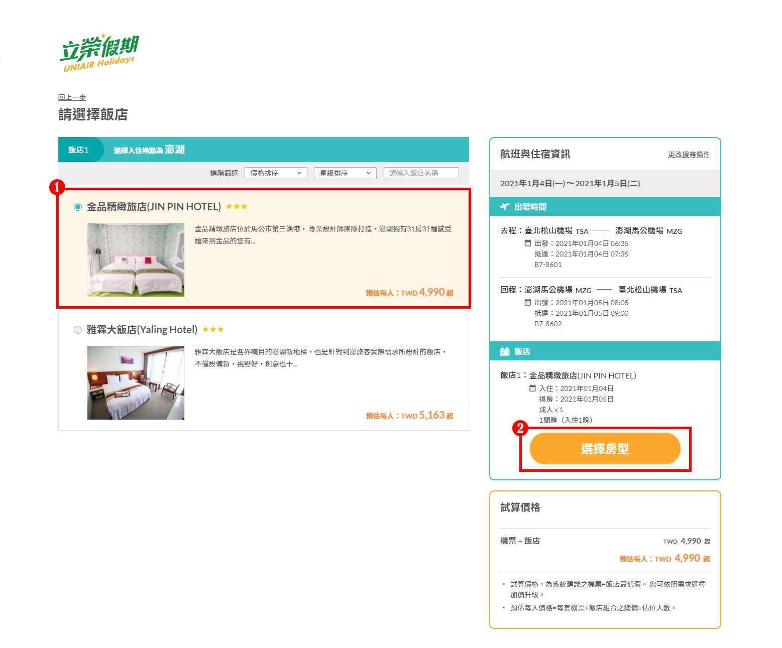 瀏覽並選擇去程及回程航班組合。並點選右方『選擇飯店』按鈕,繼續訂購流程。