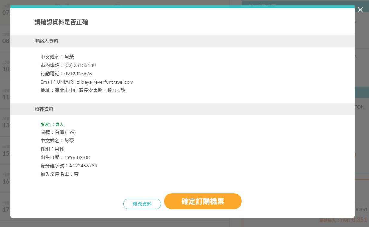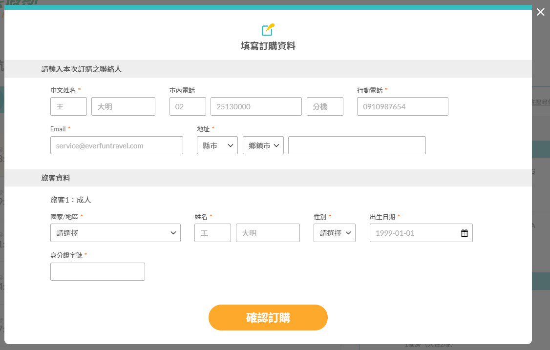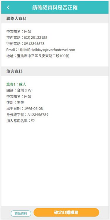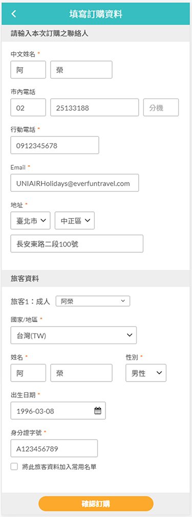 若選擇訂機票,需先填寫訂購資料,填寫完成後按下『確認訂購』按鈕。