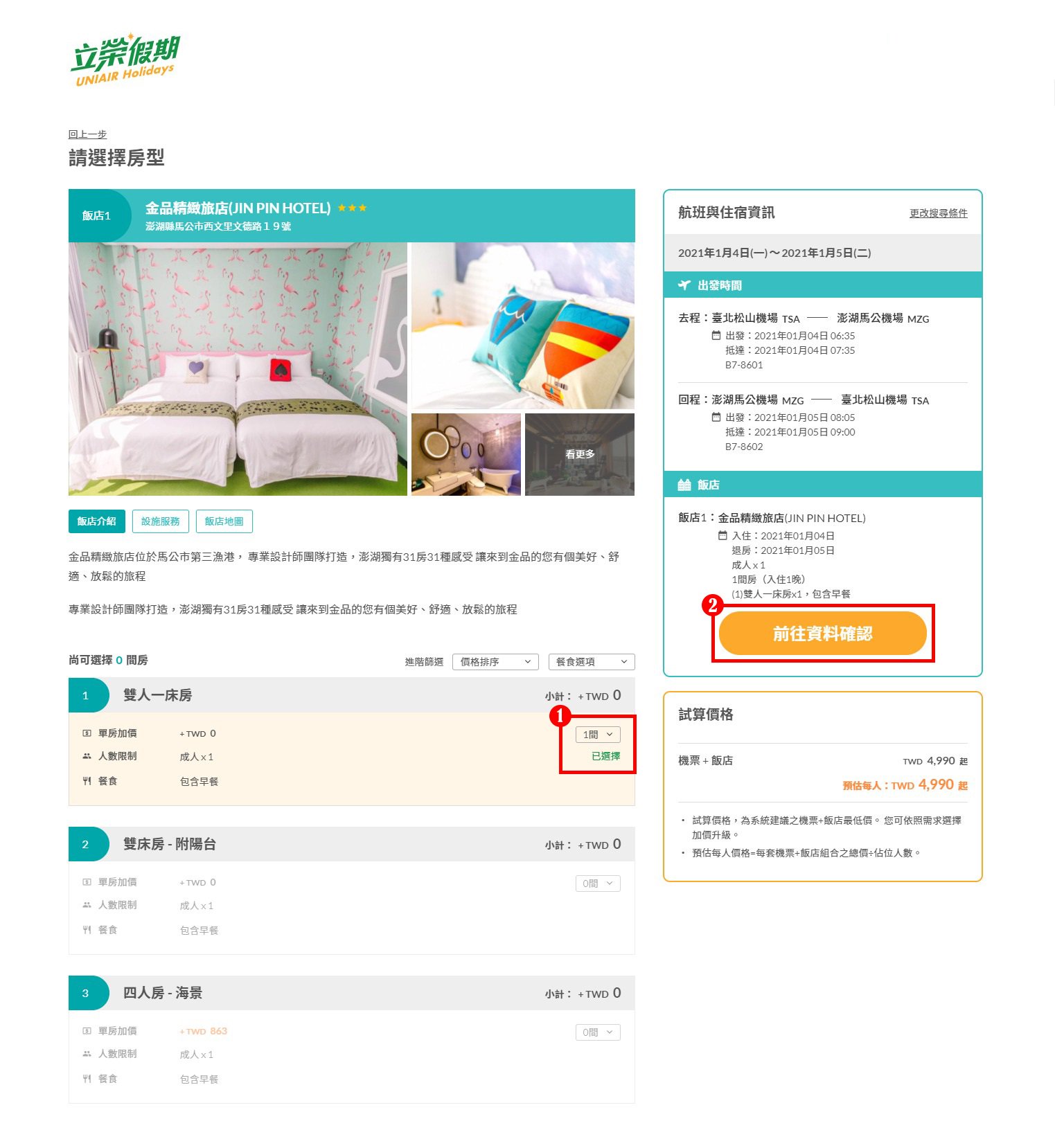 請點選『房間間數』後,並點選右方『前往資料確認』按鈕,繼續訂購流程。