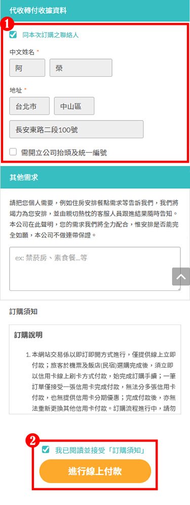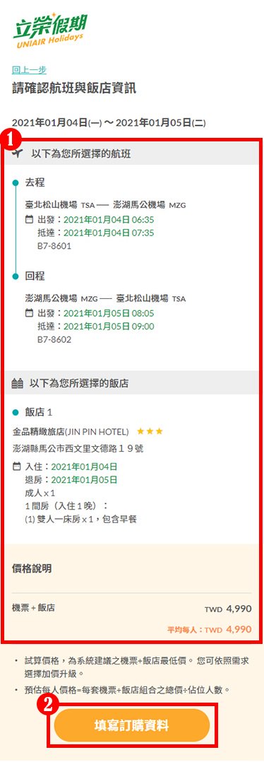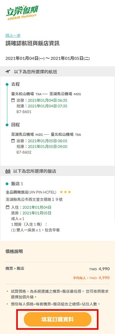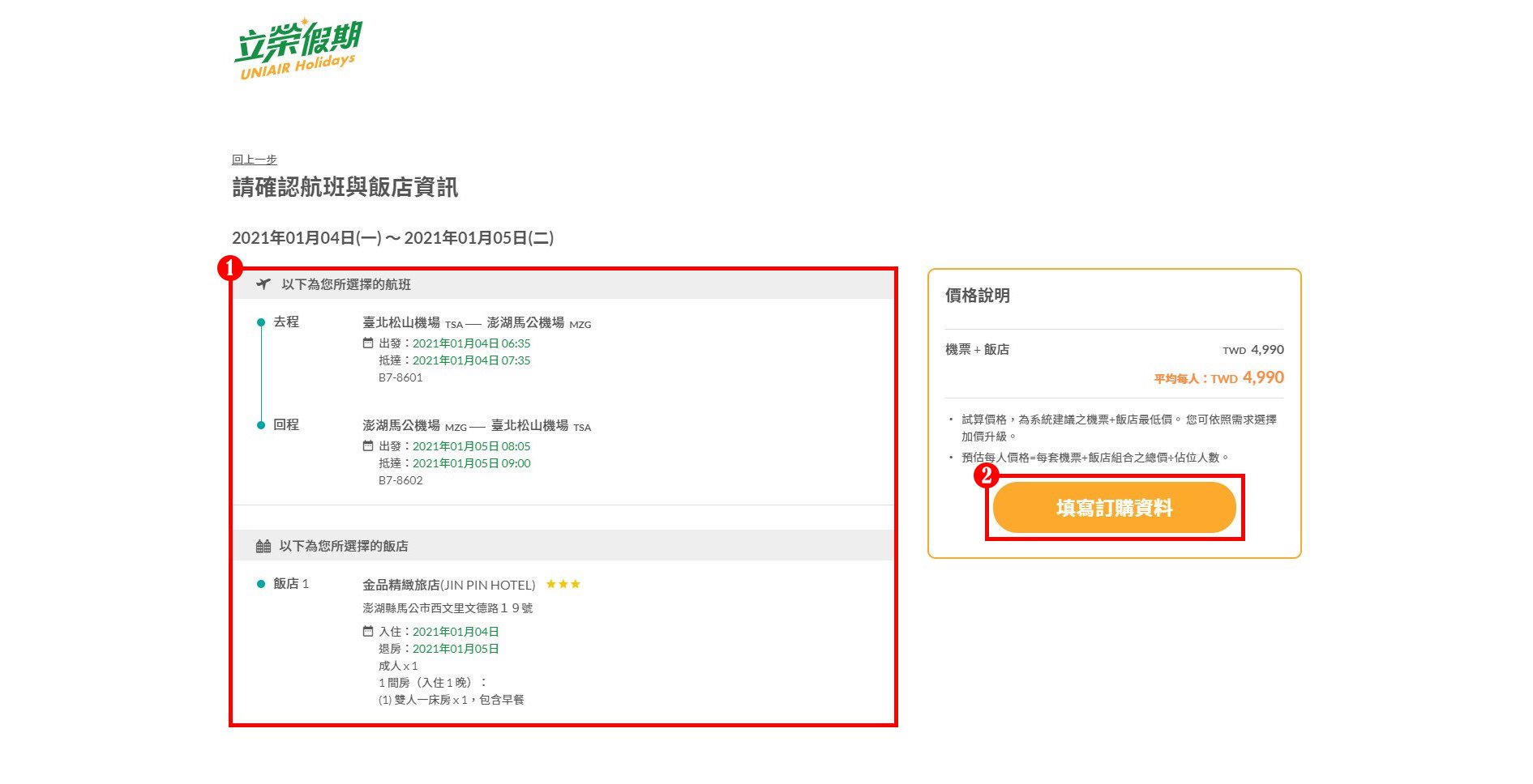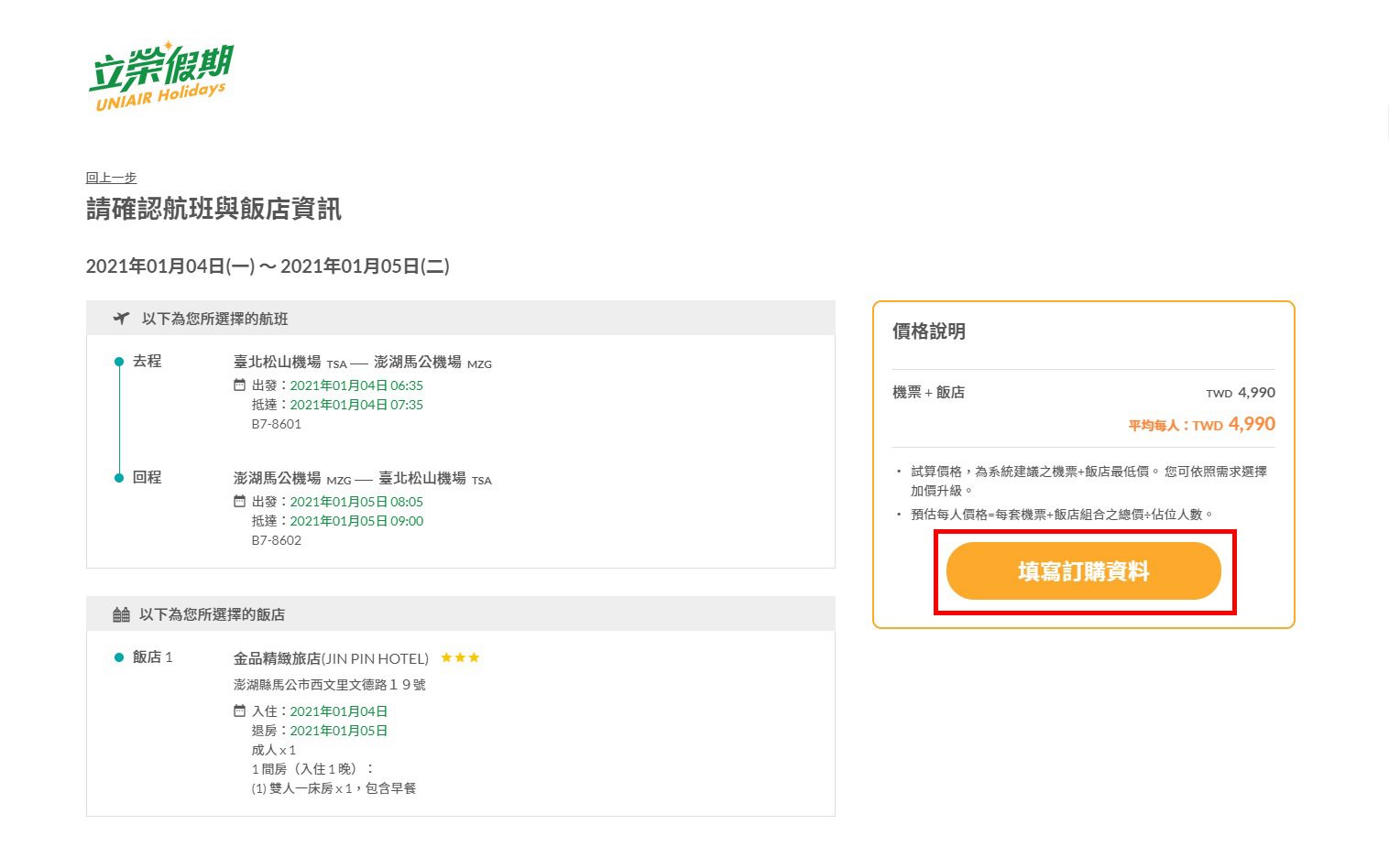 3. 確認航班與飯店資訊後,請點選『填寫訂購資料』