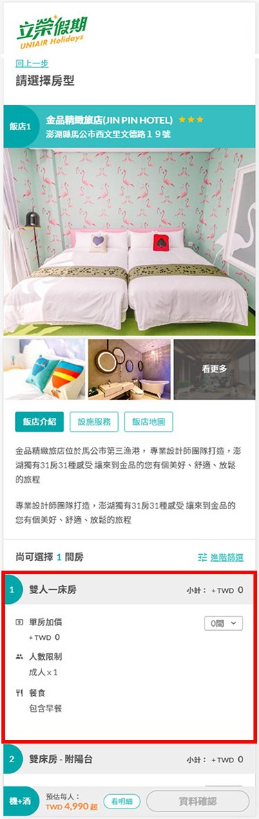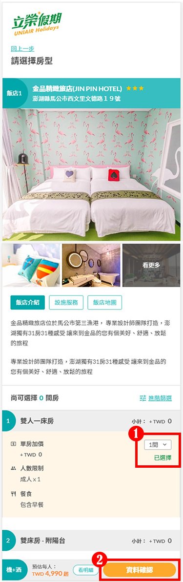 - 若您欲更改飯店,請點選『回上一步』連結,重新選擇飯店。