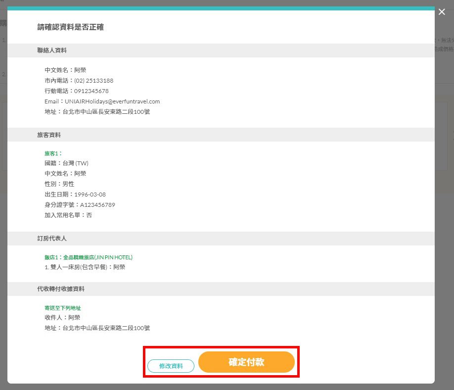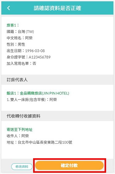 確認旅客資料與訂房代表人等相關資訊,如確定請按下『確定付款』,進行線上付款作業。