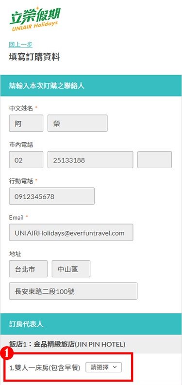 填寫聯絡人與旅客資料後,並選擇訂房代表人。