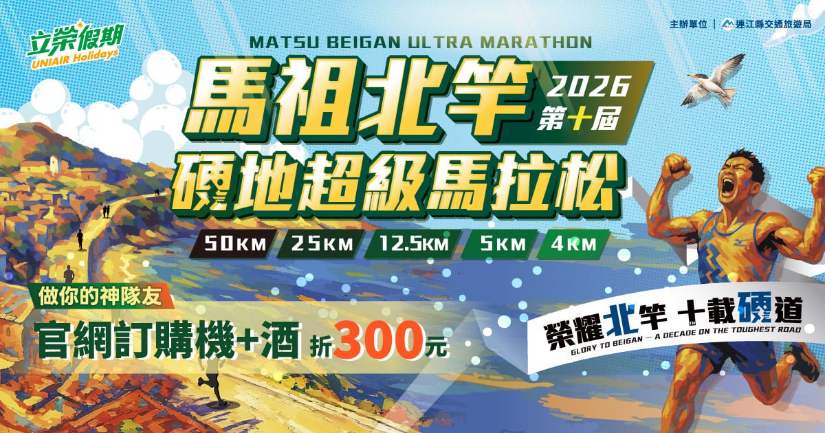 馬祖盛事「北竿硬地超級馬拉松」今年滿 10 週年,在充滿陡坡的地型衝刺,北竿馬拉松也因此被稱為是最「硬」的馬拉松挑戰!立榮假期也共襄盛舉,推出機+酒專屬優惠,做你最可靠的神隊友!