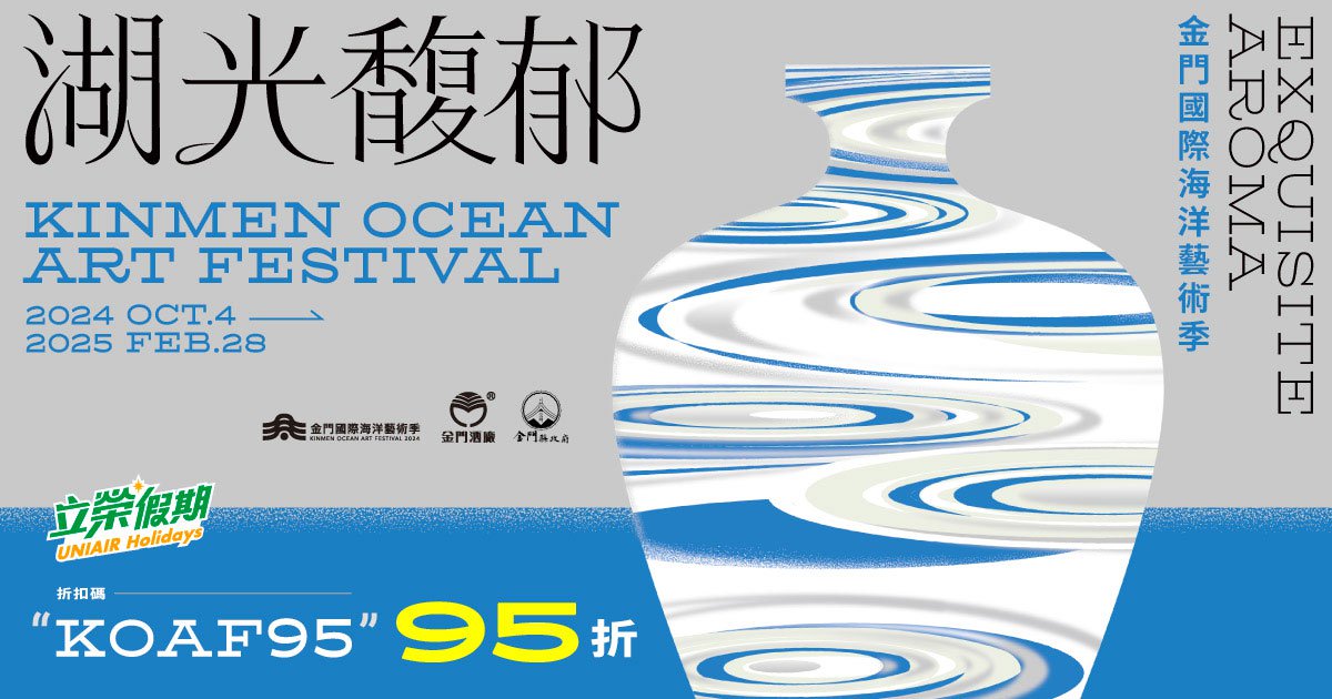2024金門海洋藝術季以湖光馥郁為主題,裝置藝術、水舞秀齊發,還有純正的高粱酒等你品嘗,現在就訂購立榮假期金門機 + 酒,結帳輸入折扣碼「KOAF95」享95折優惠!