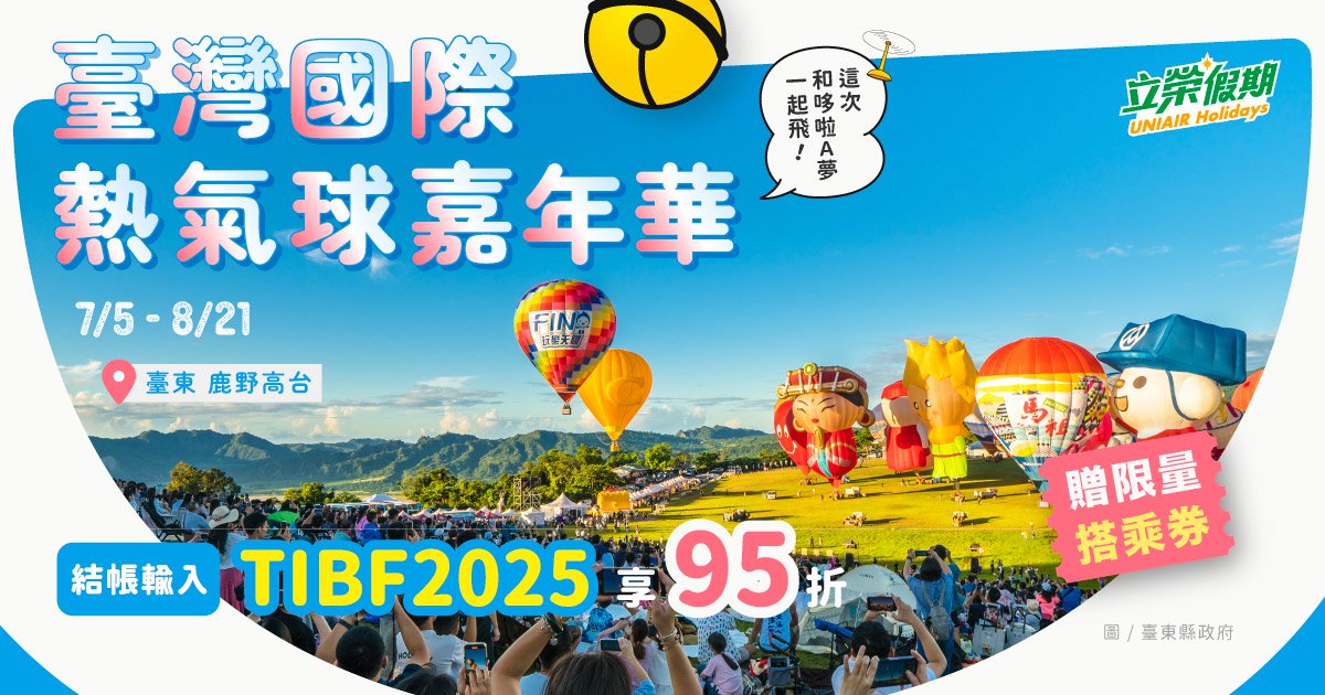 2025「臺灣國際熱氣球嘉年華」在臺東鹿野熱烈登場,與全球人氣IP「哆啦A夢」巨型熱氣球首度合作,讓你喚起滿滿童年回憶!期間還有萬球齊飛、光雕音樂會、無人機表演等精彩活動,千萬別錯過~即日起至7/31於立榮假期官網訂購台東機加酒,不只享專屬折扣碼「TIBF2025」95折優惠,還有機會獲得熱氣球搭乘券!快把握優惠,與哆啦A夢一起飛向台東的藍天吧!