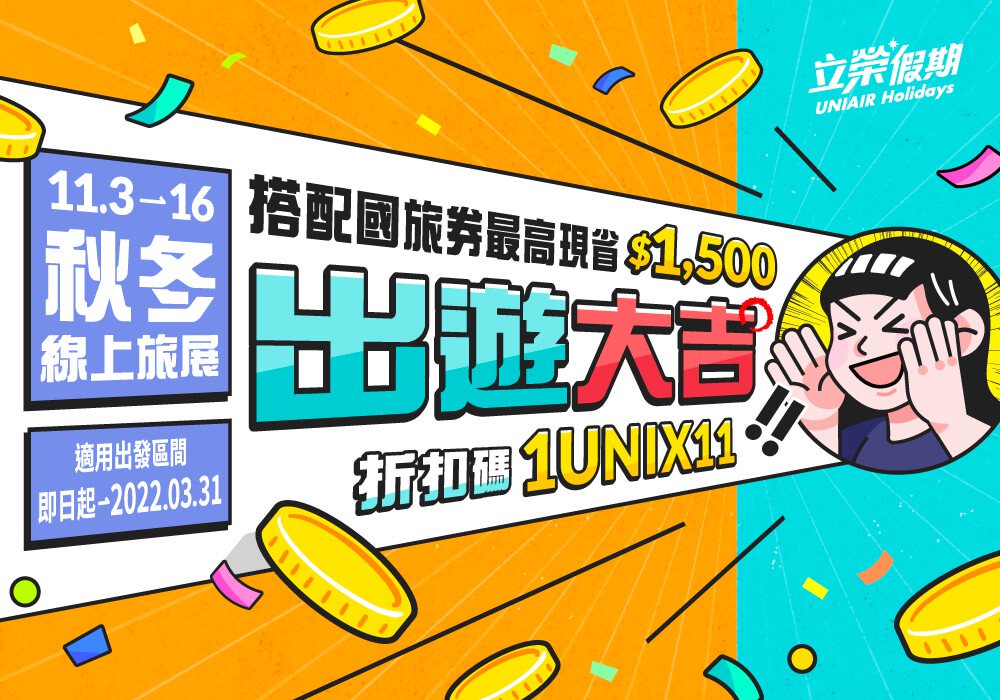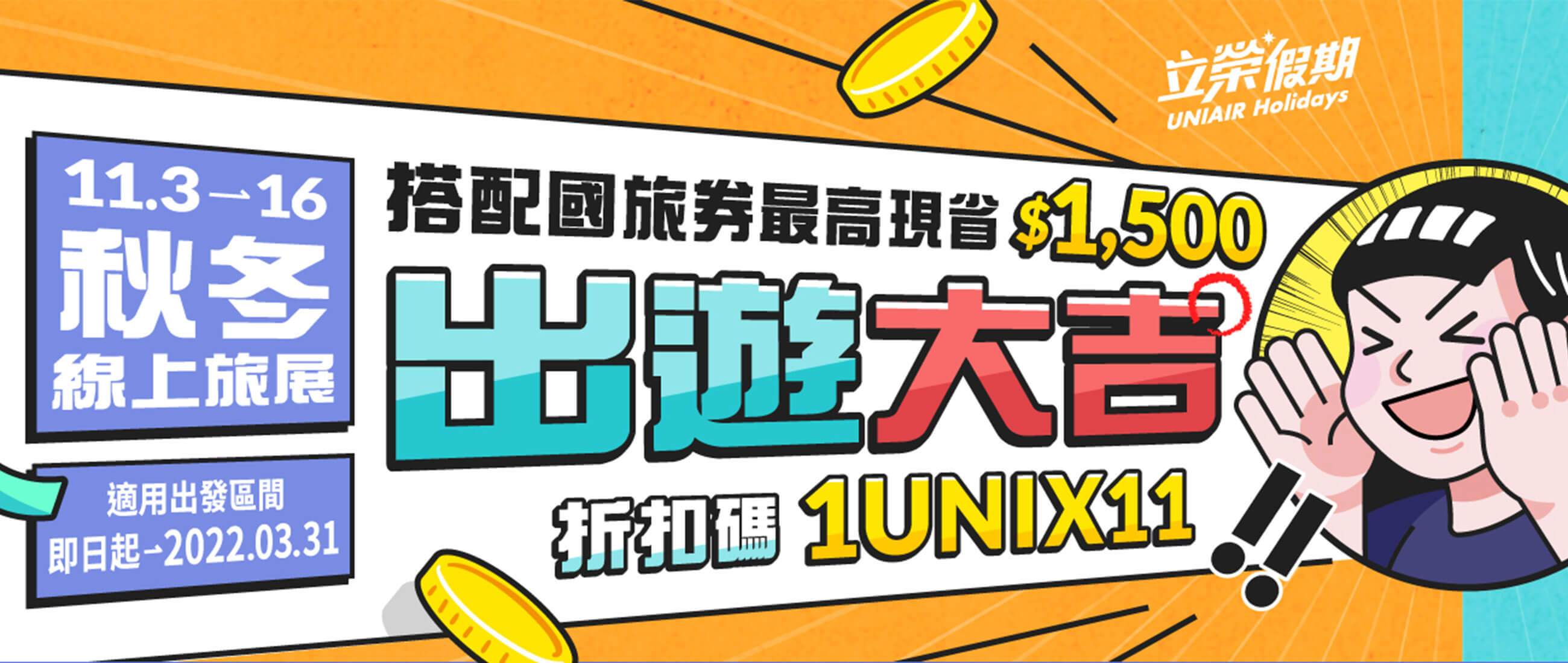 機加酒結帳時輸入折扣碼「1UNIX11」訂單現折500,使用國旅券請於結帳時輸入國旅券代碼和身分證末4碼。