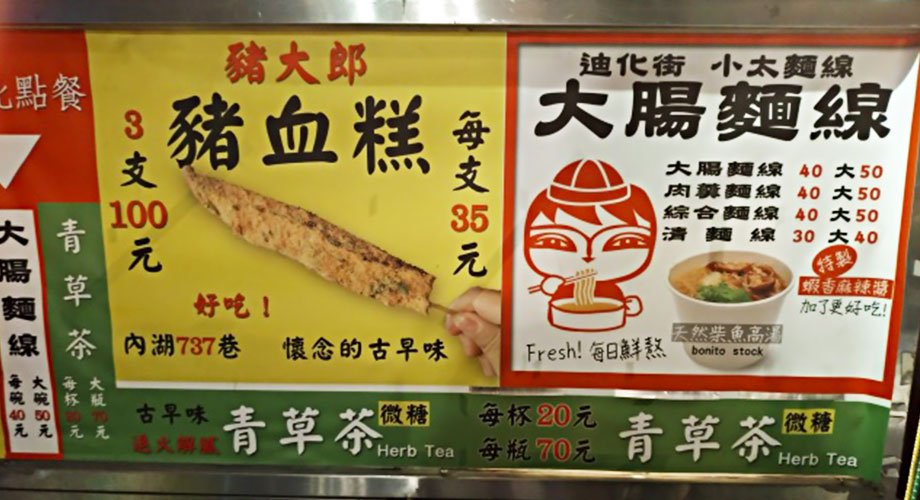 蚵仔煎、虱目魚肚粥、炒米粉、大餅包小餅、萬巒豬腳、大腸蚵仔麵線、潤餅、燒仙草、筒仔米糕、花枝羹、東山鴨頭、肉圓等,道地台灣小吃各來一份吧!