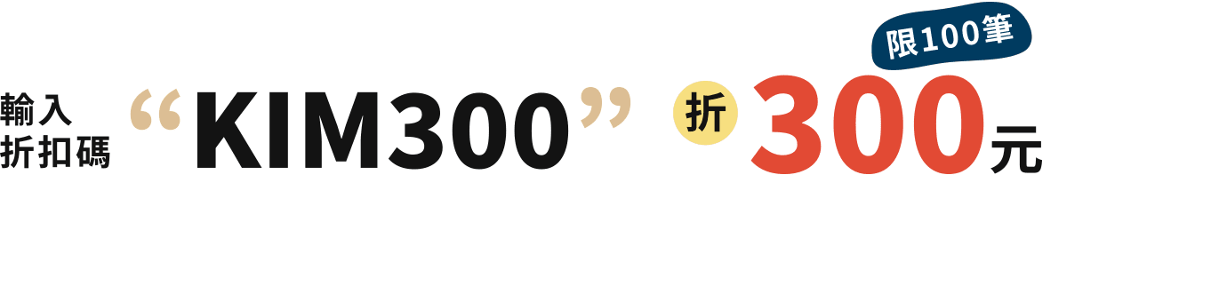 單筆機加酒結帳時輸入折扣碼「KIM300」,現折300元。