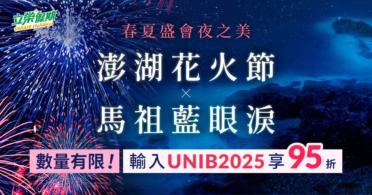 春夏正是最適合前往澎湖和馬祖,享受夢幻奇景的時刻!75週年史努比將在澎湖花火節萌翻全場,絢爛煙火與可愛無人機光影,無論大人或小孩都非常喜愛!而在馬祖,隨著夜幕降臨,藍眼淚的神秘光芒在海面上閃爍,彷彿置身星河之中。就讓立榮假期帶領您出發外島度過美好時光,3/3 ~ 3/23活動期間於官網輸入折扣碼「UNIB2025」,享機加酒95折,限量500組。趕緊卡位為您的春夏旅遊增添燦爛色彩!