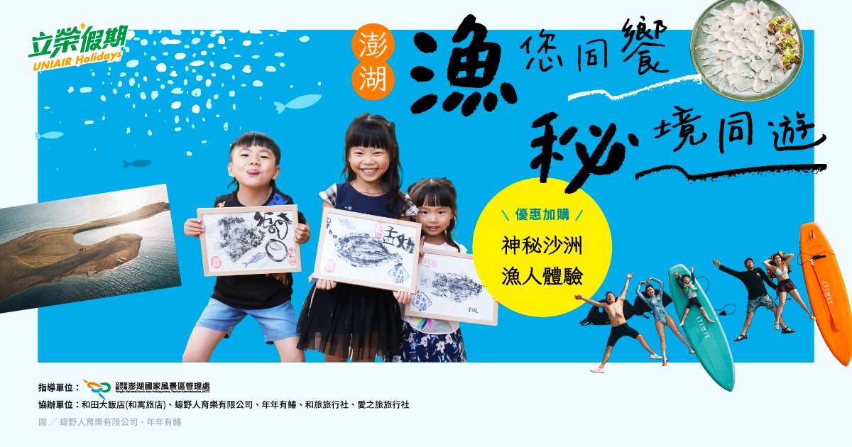 你知道澎湖有哪些有趣的體驗活動嗎?「漁您同饗,秘境同遊」將帶你尋找失落的秘境沙洲、製作魚拓魚標本、敲敲魚乾等,讓我們一起探索澎湖無限可能~活動期間於立榮假期官網完成機 + 酒訂單後,點選「行程加購」,就能選擇豐富的加購遊程!
