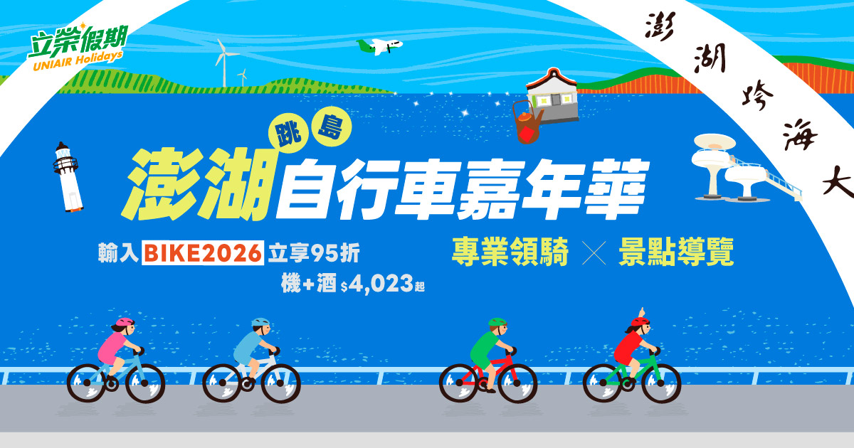 活動期間於「立榮假期」官網訂購澎湖指定出發區間機加酒,結帳時輸入專屬折扣碼「BIKE2026」,立即享單筆95折優惠!