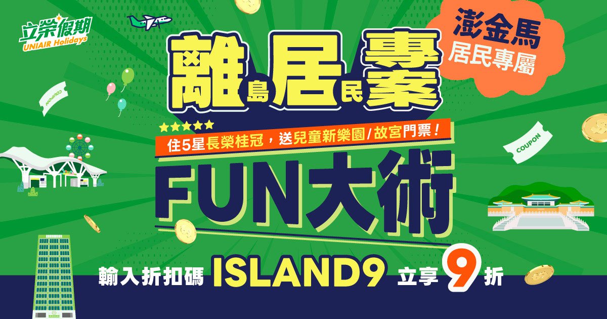活動期間於「立榮假期」官網訂購指定出發區間機加酒,結帳時輸入專屬折扣碼「ISLAND9」,立即享單筆機加酒 9折 優惠!