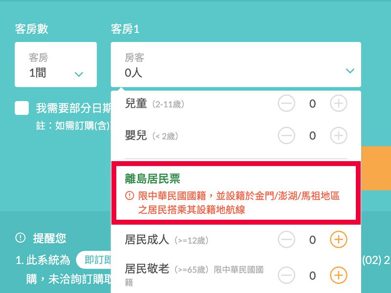 若要訂購離島居民票,請於立榮假期首頁依序選擇出發地、目的地、日期、房間數,並於房客人數欄位選取「離島居民票」。 |
