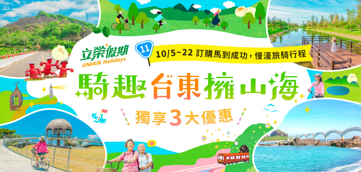 臺東是運動環境最友善的城市,坐上自行車、踩動著雙輪,蔚藍海岸與翠綠山巒交疊的自然美景便躍然眼前。即刻起至10月31日止,訂購台東指定專案行程即可享以下三大優惠,最高幫您省下$2,050元!