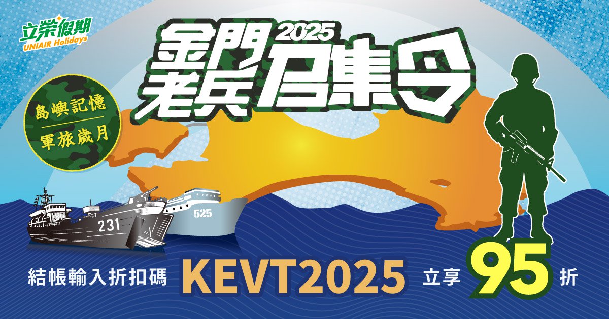 活動期間於「立榮假期」官網訂購金門指定出發區間機加酒,輸入折扣碼「KEVT2025」立享 95折 ,還有機會獲得金門縣政府的專屬紀念品,詳情請見 活動辦法