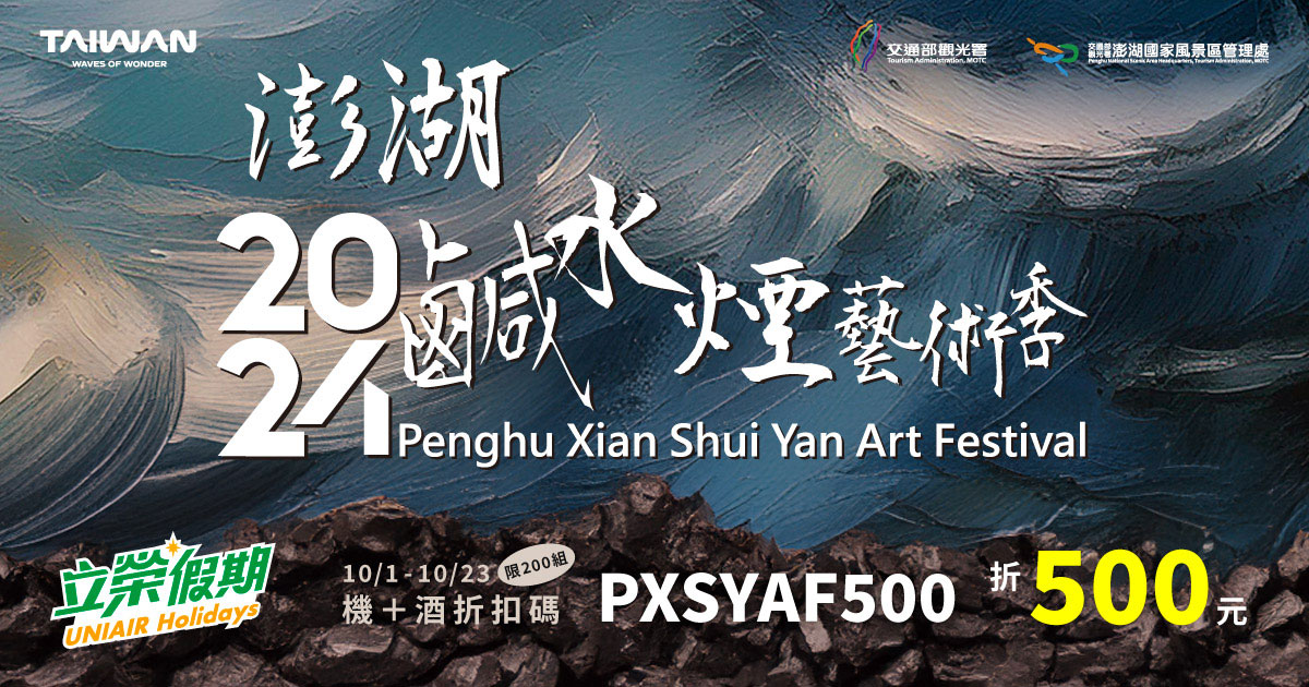 澎湖的秋冬,魅力盛典不容錯過!當東北季風吹起,空氣中瀰漫的鹽味海風與水霧,又被當地人稱為「鹹水煙」,2024澎湖鹹水煙藝術季,一場藝術與大自然結合的盛宴,活動期間輸入折扣碼「PXSYAF500」,單筆機加酒折500元!立榮假期邀您一起共襄盛舉相約澎湖。